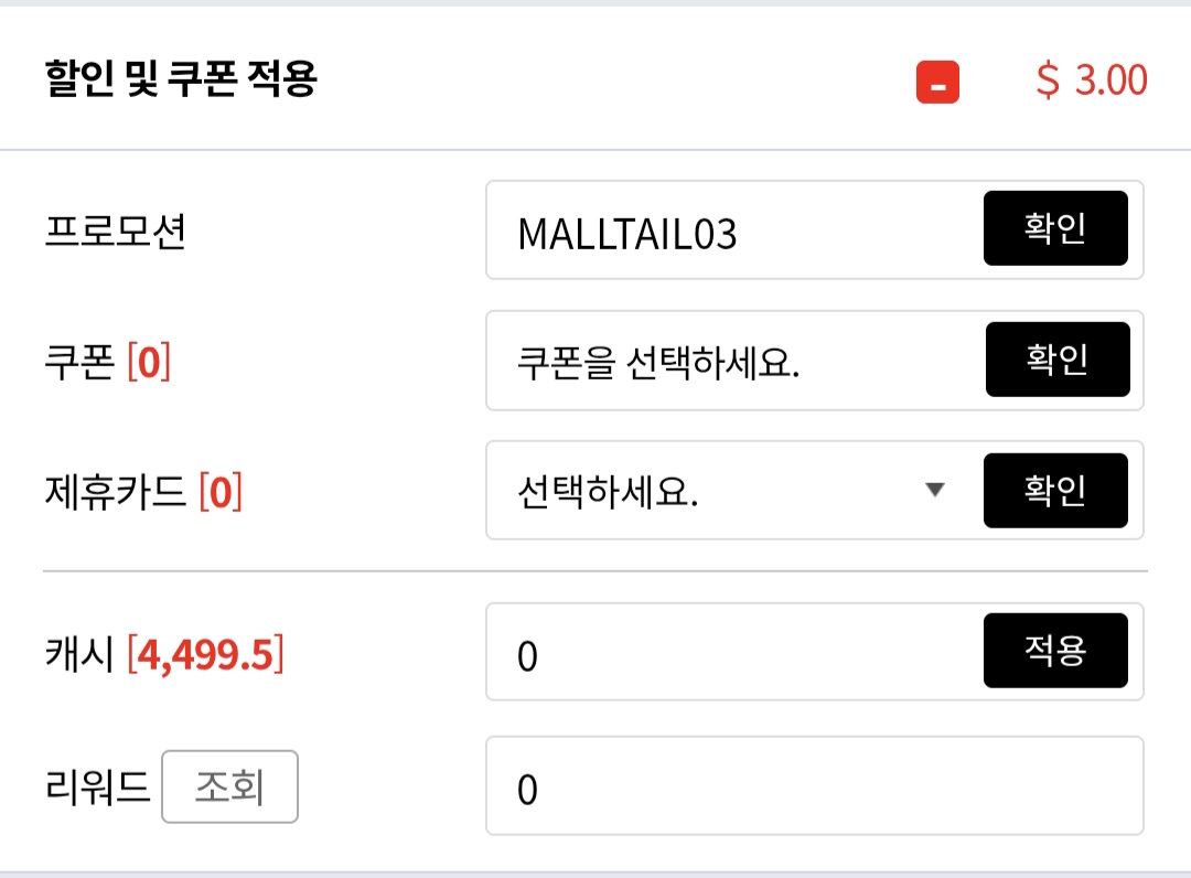 배송비 결제시 MALLTAIL03 할인코드 입력하시면 됩니다.